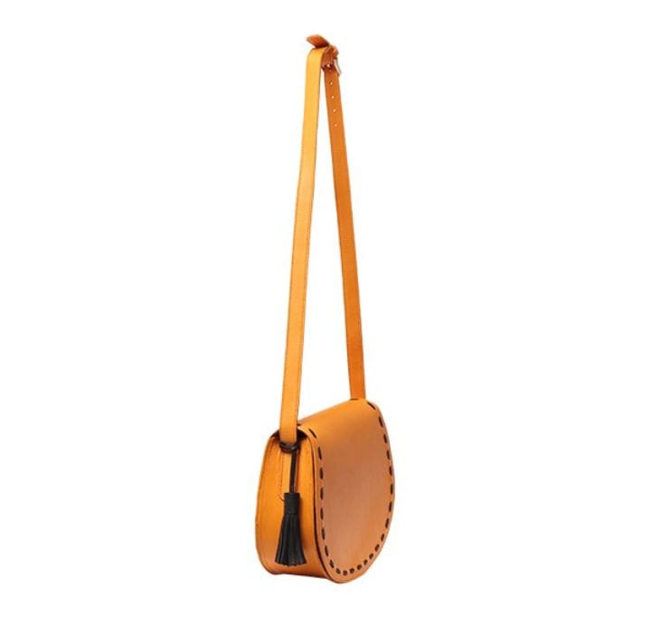 The Almando Bag is a sleek, semi-circle-shaped crossbody bag made from high-quality cowhide. Its long strap extends from the interior, offering a comfortable fit for daily use. This versatile bag can be customized in three unique styles: a plain finish, a chic embroidered design on the flap, or a subtle stitched border for added detail. DIMENSIONS: Height – 8.8 inches, Top width – 10.2 inches, Bottom width – 11.1 inches, Side width – 3 inches.