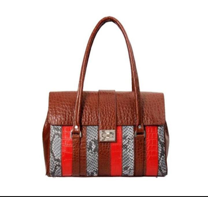 The Matar Stripes Bag is a large, spacious bag crafted from embossed cowhide. Its standout feature is the rectangular flap, secured by a leather closure running through the center and fastened with a metal clasp. The highlight of this bag is the front, where strips of different patterned leather are artfully arranged to create a one-of-a-kind design. Complete with a long handle that extends from the body and sturdy bag feet, The Matar Stripes combines practicality with striking aesthetics. DIMENSIONS: Height – 13.5 inches, Width – 15 inches, Handle height – 8 inches.