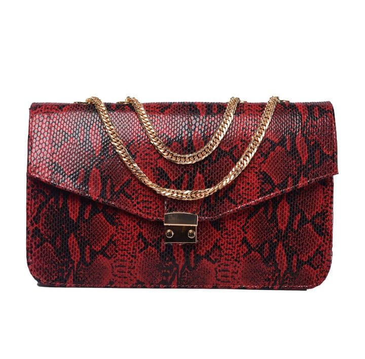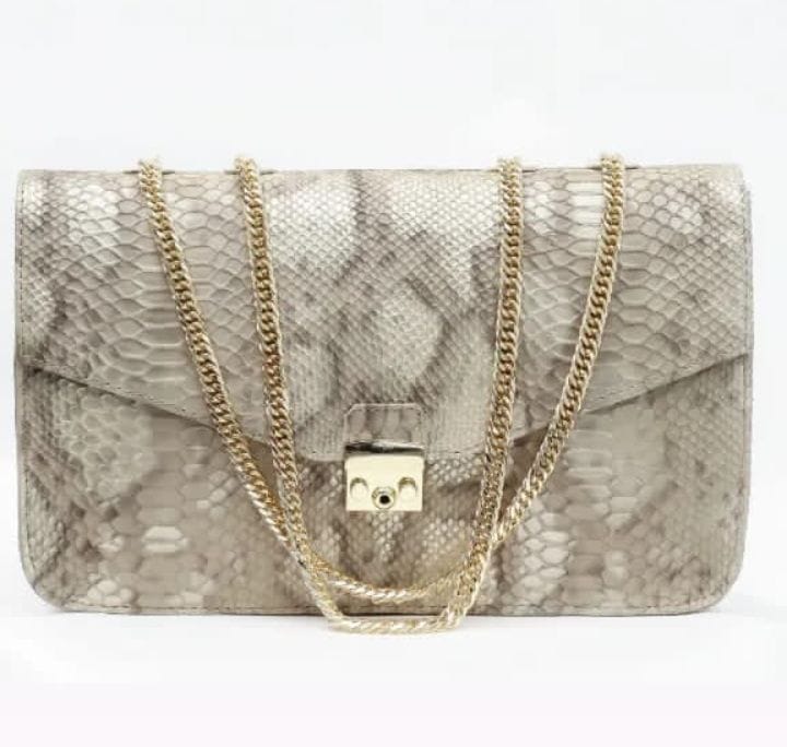 The Raisa Bag combines functionality with a unique design, featuring a rectangular shape with gracefully curved edges. The triangular flap offers versatility with a choice of a metallic press buckle closure or a classic button closure. Crafted from embossed cowhide or sheepskin, it stands out with its slightly longer top handle secured by buckles on both sides, or an adjustable chain handle for added convenience. Inside, you’ll find ample space with a middle compartment and additional side compartments, making it perfect for organizing your essentials. DIMENSIONS: Height – 9 inches, Width – 13.5 inches.